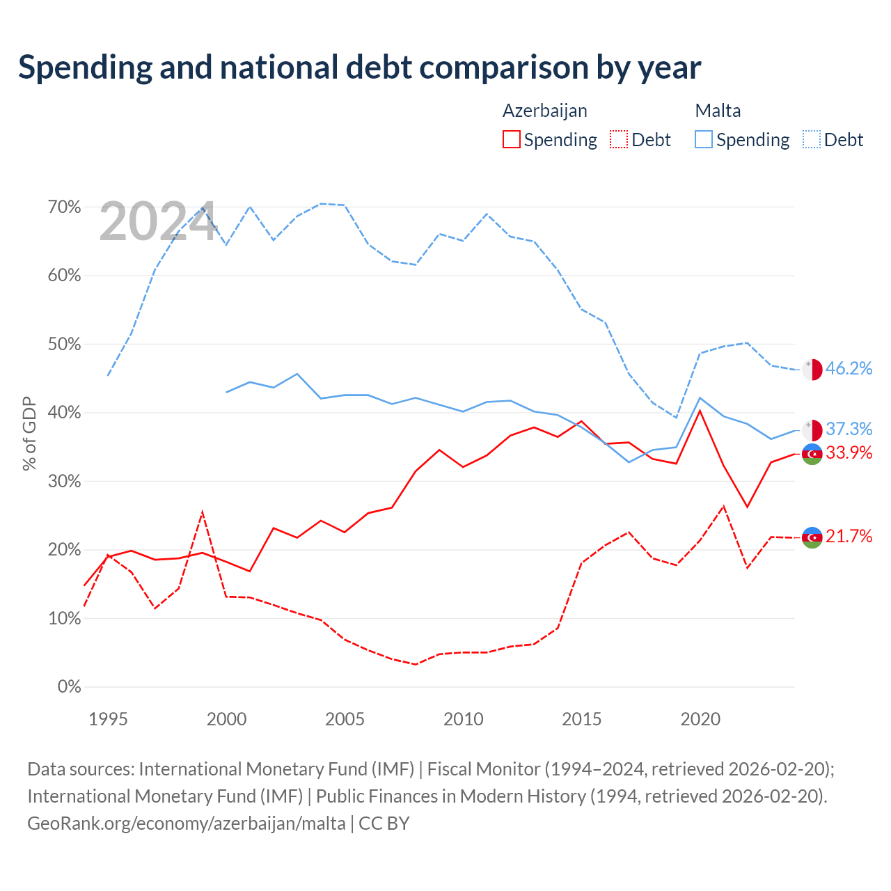 Azerbaijan has $16.1B in government debt (21.7% of GDP), compared to $11.5B (46.2% of GDP) in Malta.