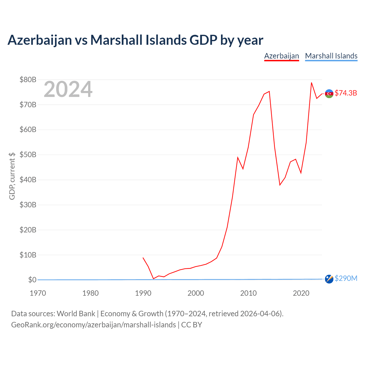 Azerbaijan has a GDP of $74.3B compared to $290M for the Marshall Islands, ranking 84/197 and 193/197 by economy size, respectively.