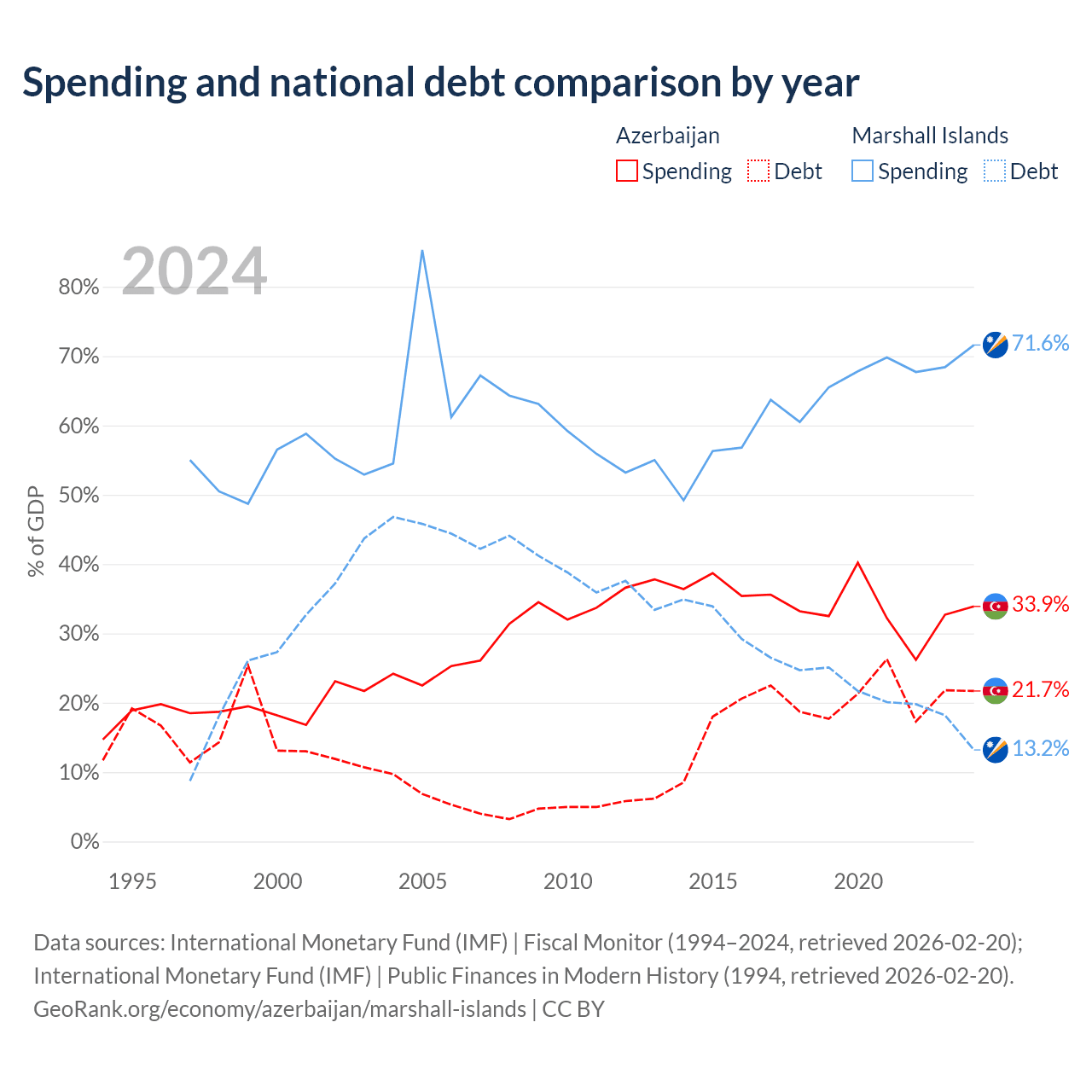 Azerbaijan has $16.1B in government debt (21.7% of GDP), compared to $38.4M (13.2% of GDP) in the Marshall Islands.