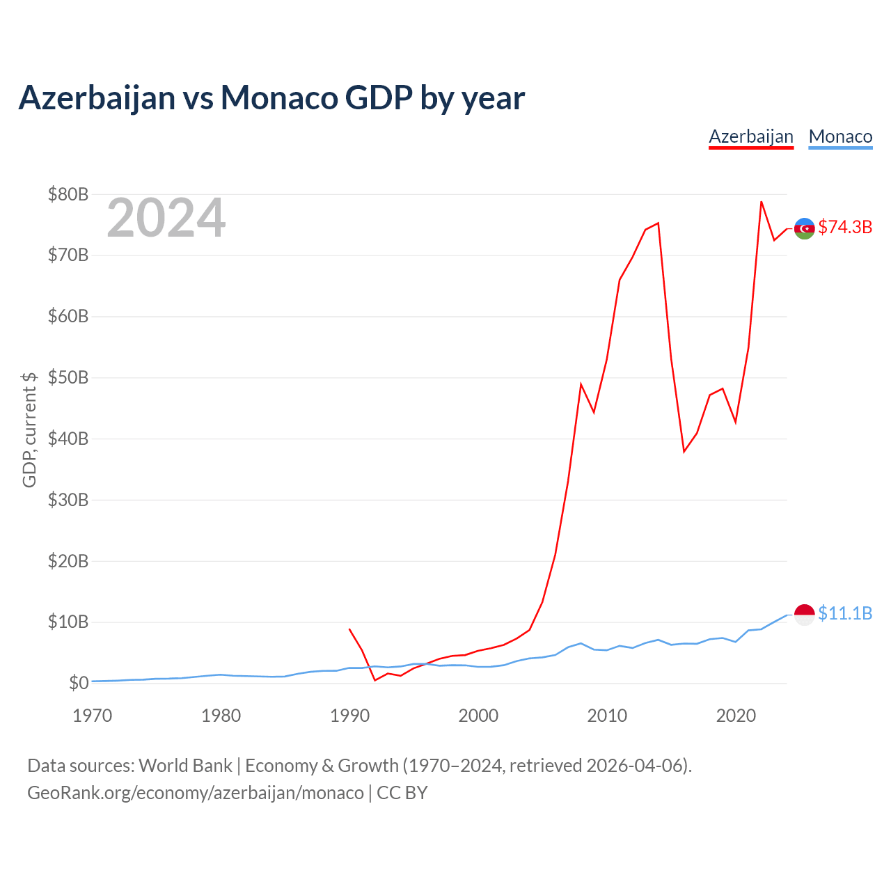 Azerbaijan has a GDP of $74.3B compared to $11.1B for Monaco, ranking 84/197 and 152/197 by economy size, respectively.