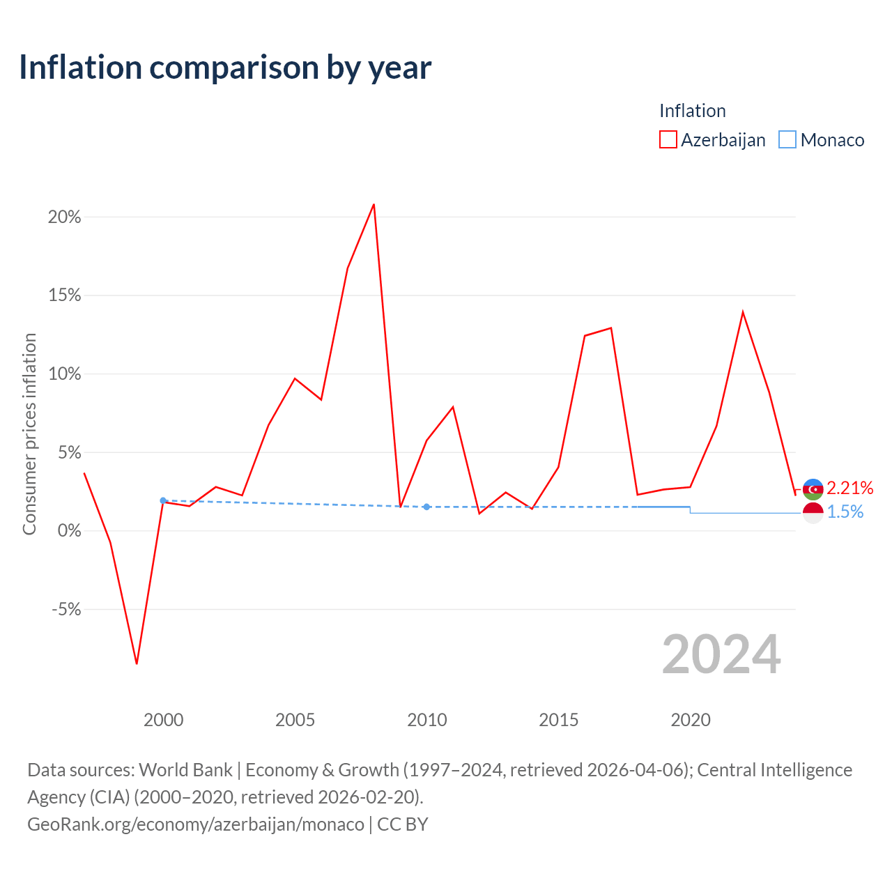 Over the past 21 years, Azerbaijan has recorded an average annual inflation rate of 6.07%, compared with 1.58% in Monaco. In 2020, inflation was 2.21% in Azerbaijan and 1.5% in Monaco.