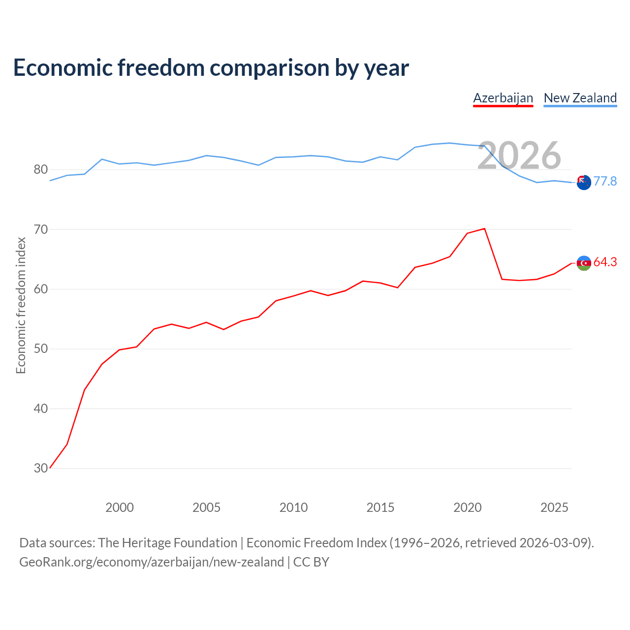 The Economic Freedom Index for Azerbaijan is 64.3, ranking 74/197, compared to 77.8 for New Zealand, ranking 13/197. The chart above displays a comparison of annual changes in economic freedom indexes.