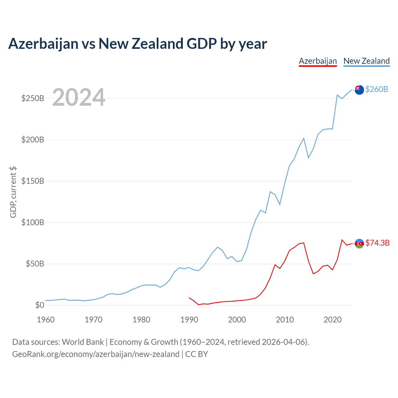 Azerbaijan has a GDP of $74.3B compared to $260B for New Zealand, ranking 84/197 and 52/197 by economy size, respectively.