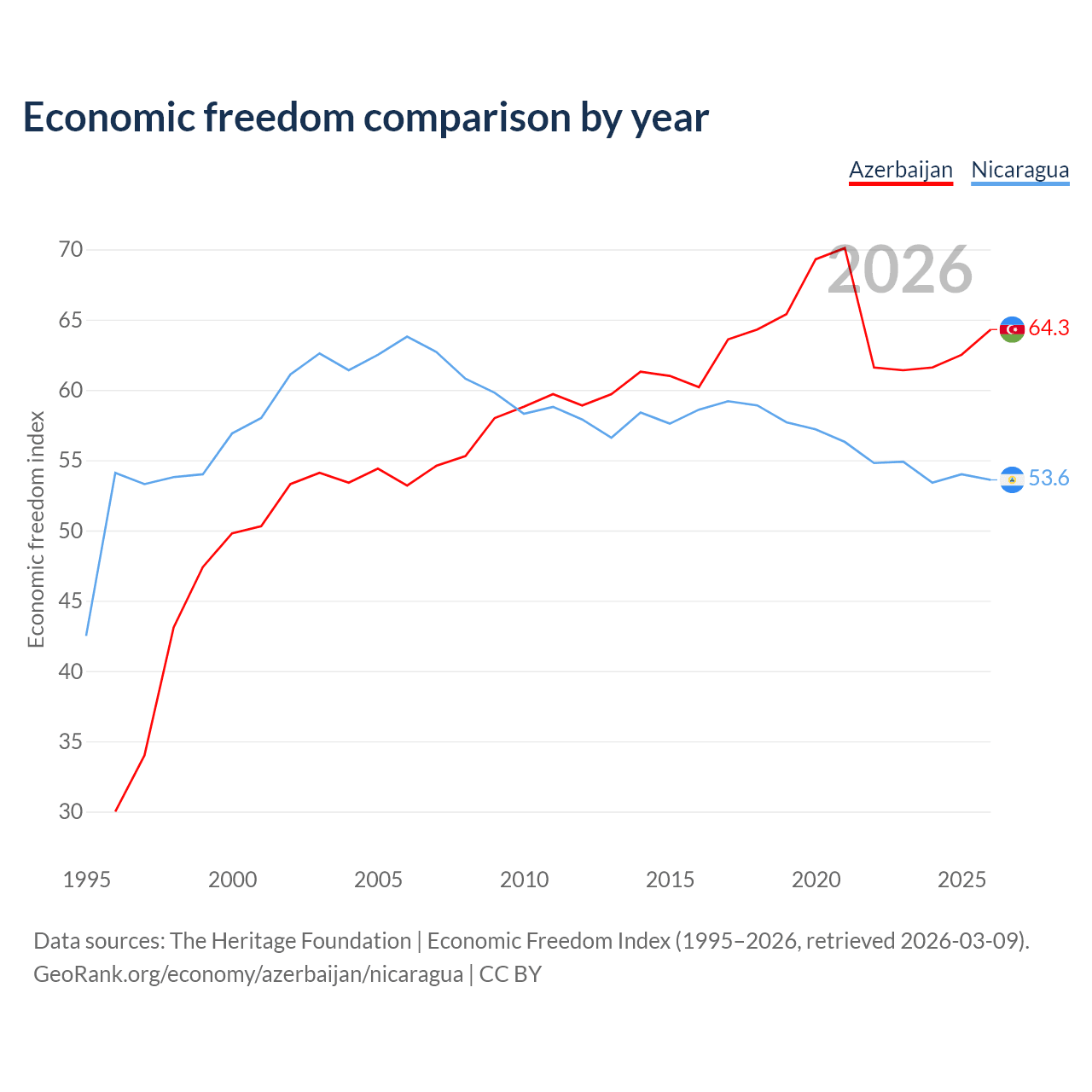 The Economic Freedom Index for Azerbaijan is 64.3, ranking 74/197, compared to 53.6 for Nicaragua, ranking 139/197. The chart above displays a comparison of annual changes in economic freedom indexes.