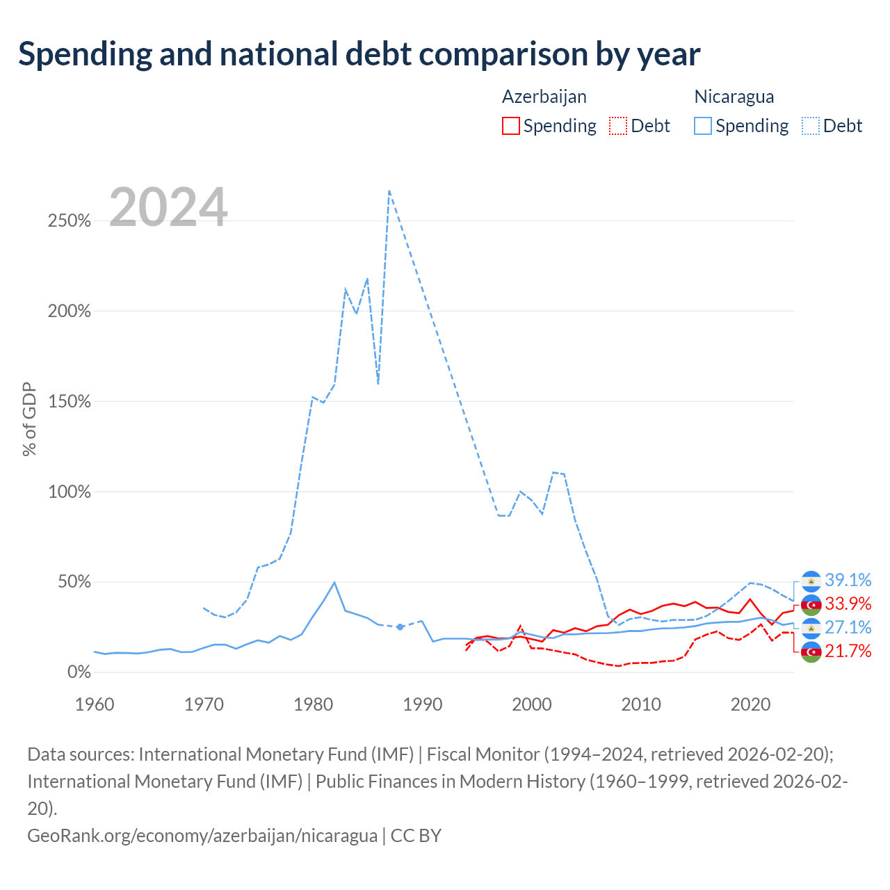 Azerbaijan has $16.1B in government debt (21.7% of GDP), compared to $7.71B (39.1% of GDP) in Nicaragua.