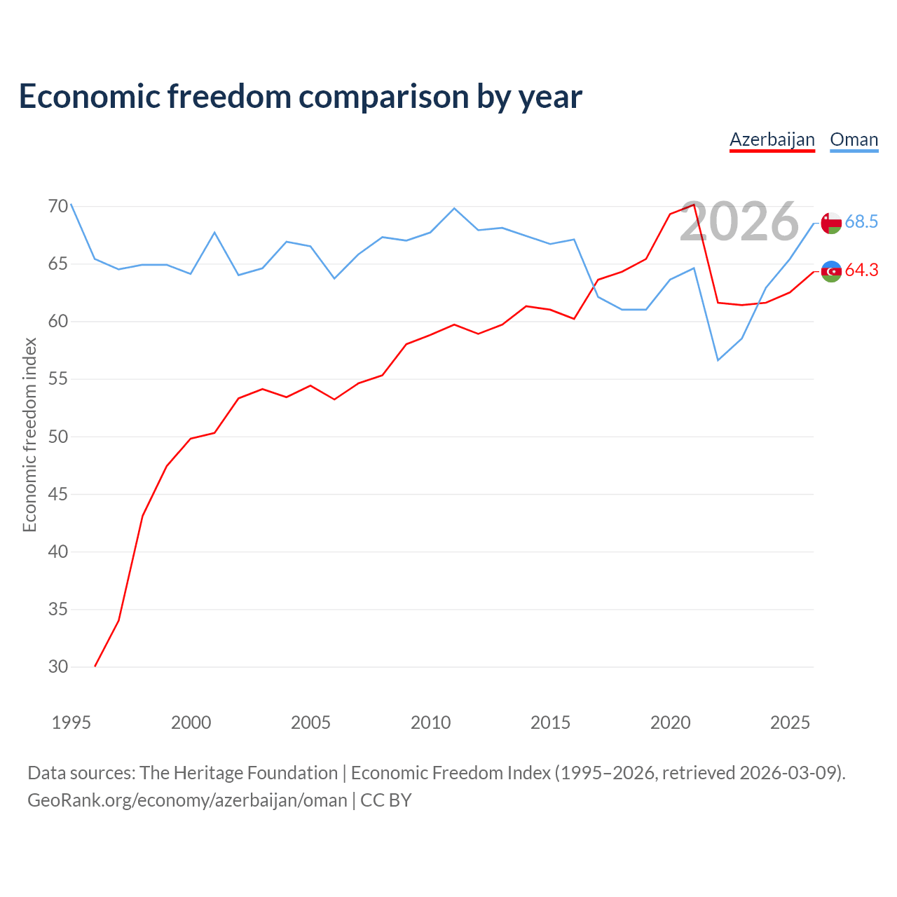 The Economic Freedom Index for Azerbaijan is 64.3, ranking 74/197, compared to 68.5 for Oman, ranking 45/197. The chart above displays a comparison of annual changes in economic freedom indexes.