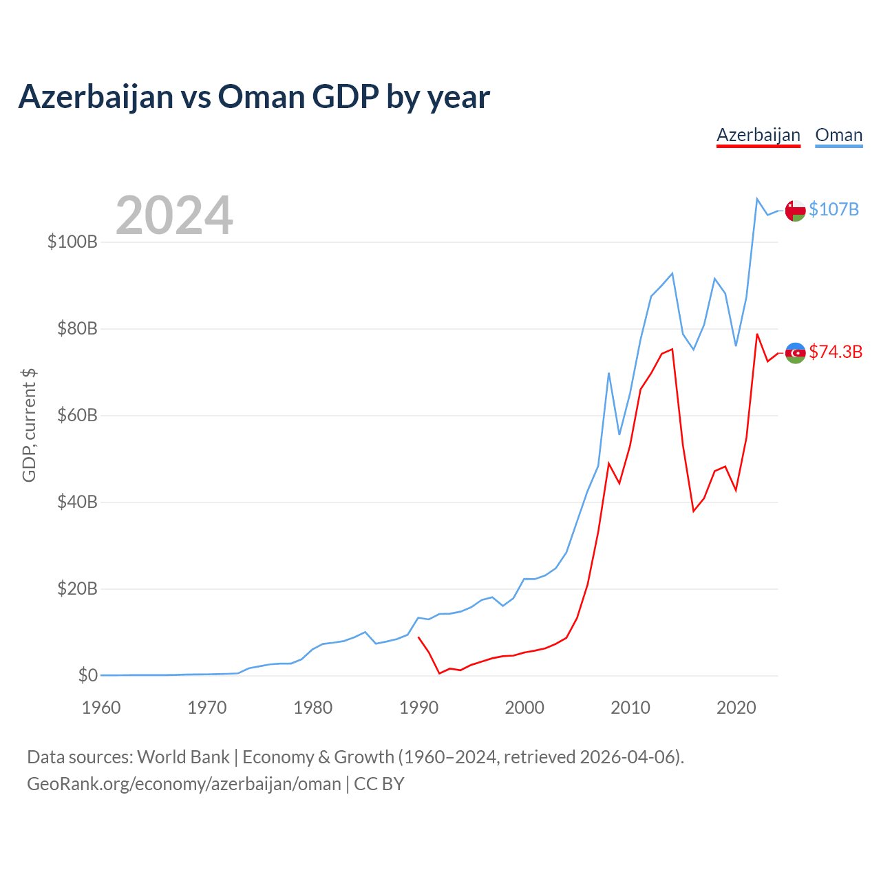 Azerbaijan has a GDP of $74.3B compared to $107B for Oman, ranking 84/197 and 70/197 by economy size, respectively.