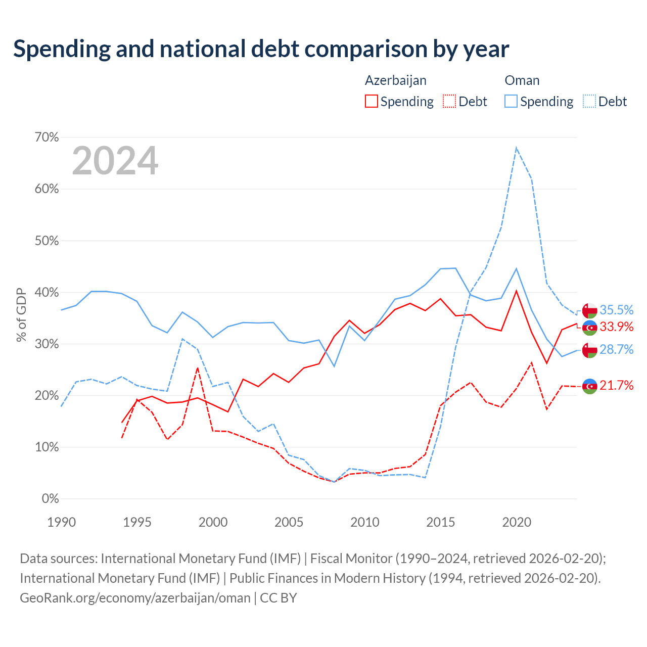 Azerbaijan has $16.1B in government debt (21.7% of GDP), compared to $38B (35.5% of GDP) in Oman.