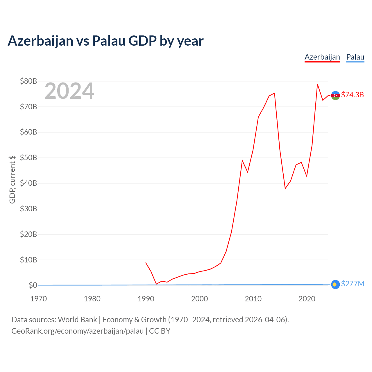 Azerbaijan has a GDP of $74.3B compared to $277M for Palau, ranking 84/197 and 194/197 by economy size, respectively.