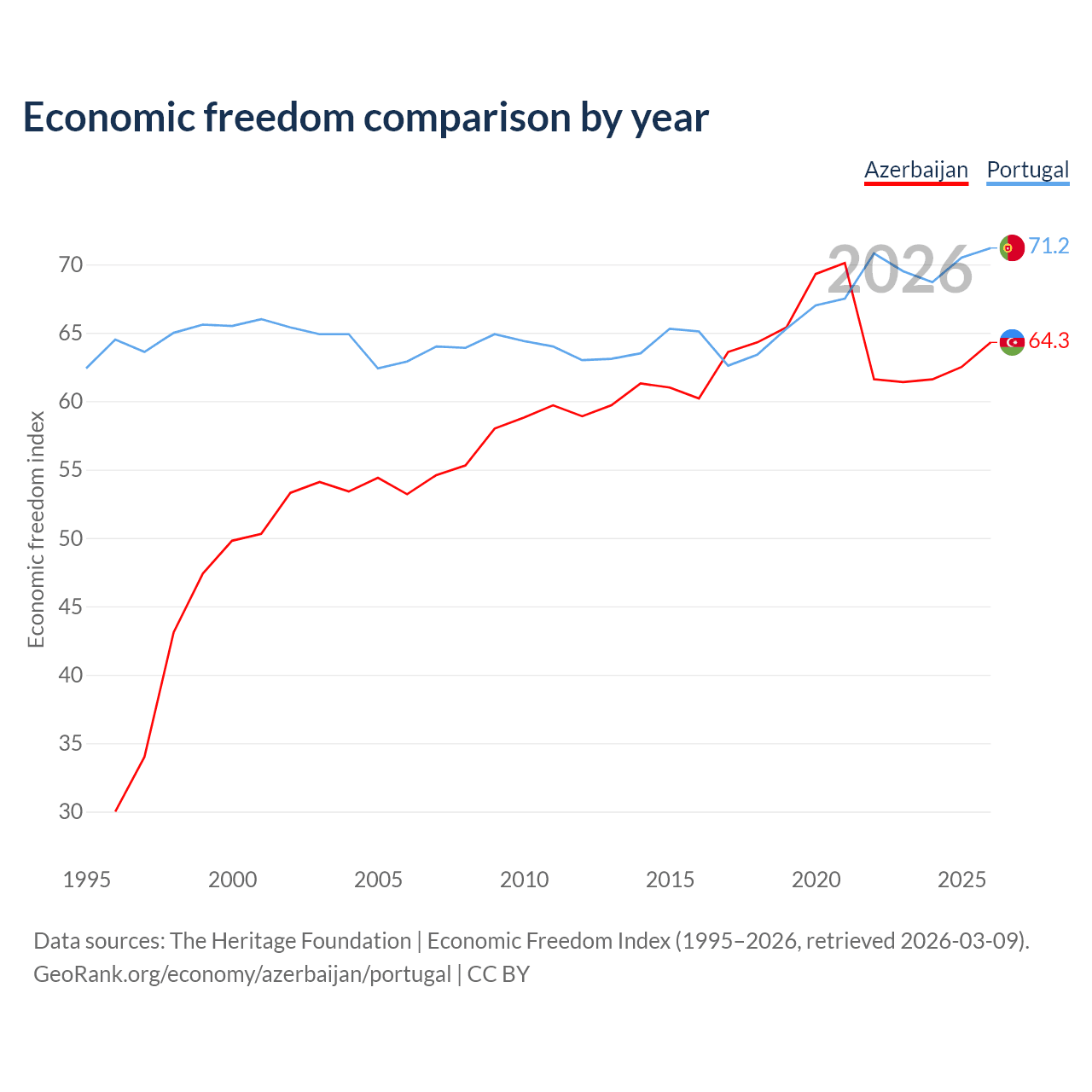 The Economic Freedom Index for Azerbaijan is 64.3, ranking 74/197, compared to 71.2 for Portugal, ranking 33/197. The chart above displays a comparison of annual changes in economic freedom indexes.