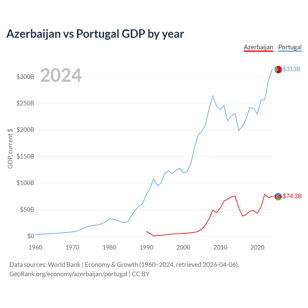 Azerbaijan has a GDP of $74.3B compared to $313B for Portugal, ranking 84/197 and 46/197 by economy size, respectively.