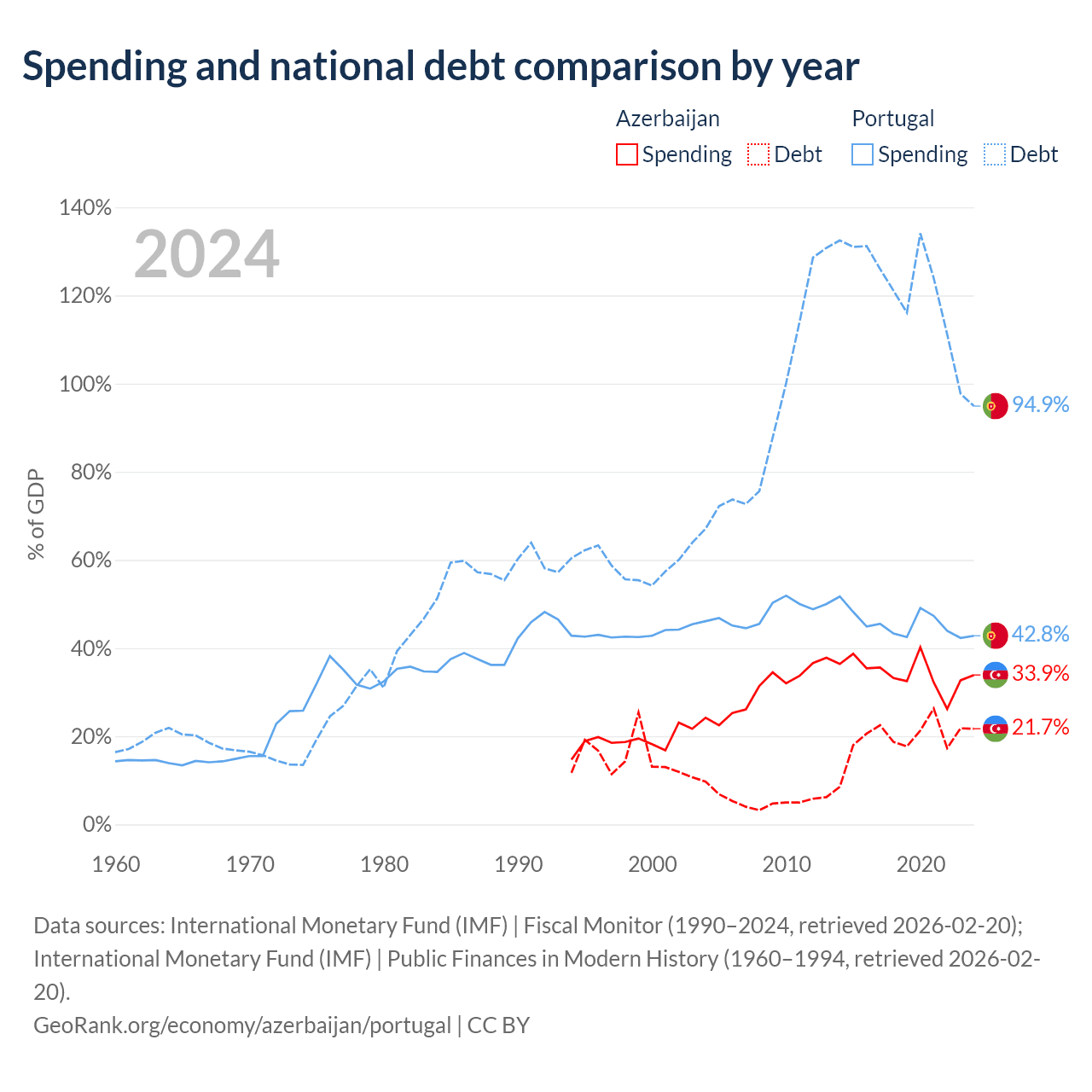 Azerbaijan has $16.1B in government debt (21.7% of GDP), compared to $297B (94.9% of GDP) in Portugal.