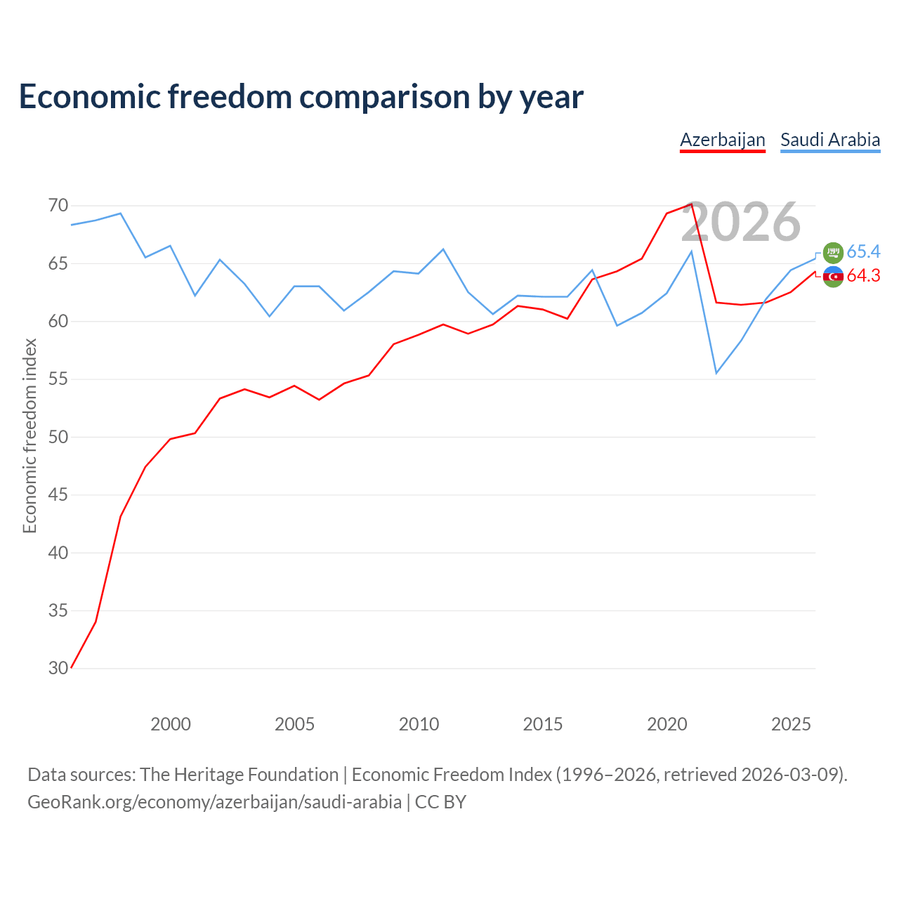 The Economic Freedom Index for Azerbaijan is 64.3, ranking 74/197, compared to 65.4 for Saudi Arabia, ranking 65/197. The chart above displays a comparison of annual changes in economic freedom indexes.