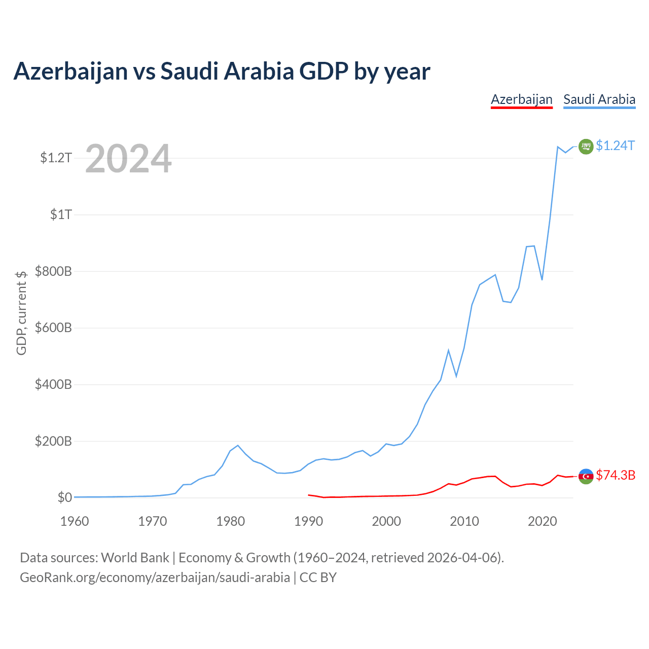Azerbaijan has a GDP of $74.3B compared to $1.24T for Saudi Arabia, ranking 84/197 and 18/197 by economy size, respectively.