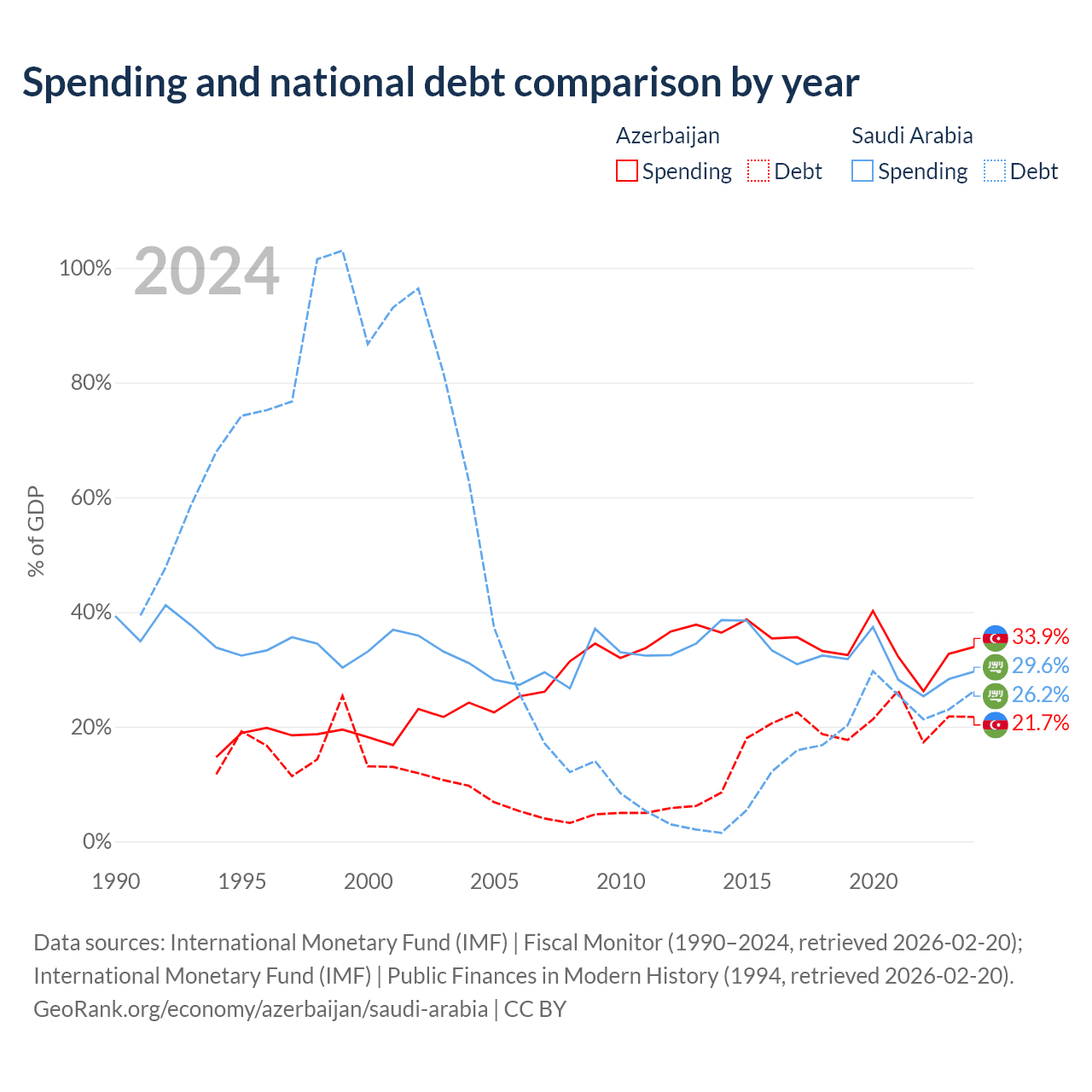Azerbaijan has $16.1B in government debt (21.7% of GDP), compared to $324B (26.2% of GDP) in Saudi Arabia.