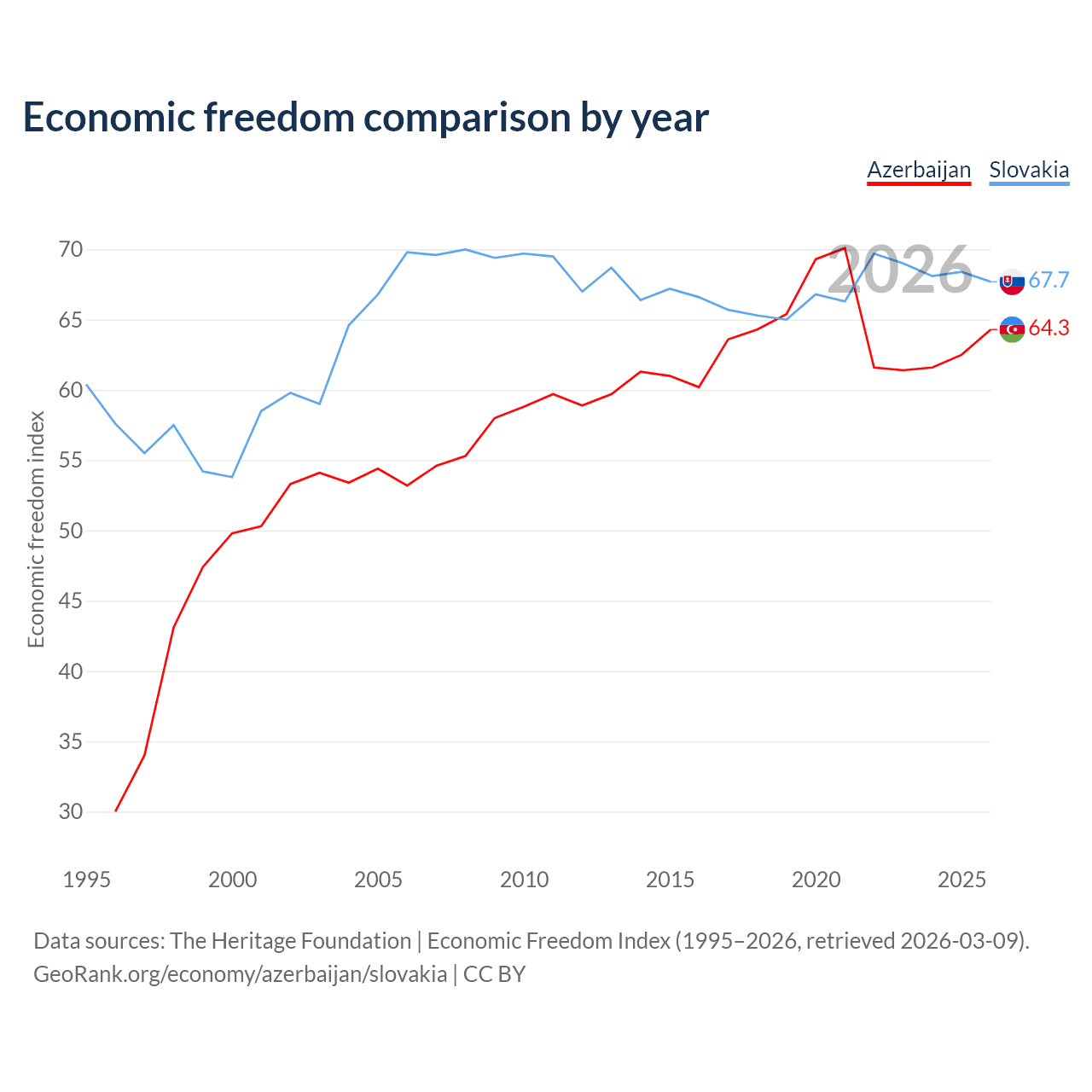 The Economic Freedom Index for Azerbaijan is 64.3, ranking 74/197, compared to 67.7 for Slovakia, ranking 54/197. The chart above displays a comparison of annual changes in economic freedom indexes.