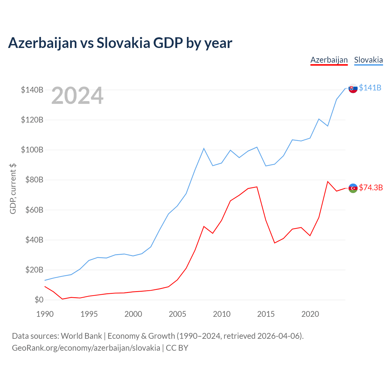 Azerbaijan has a GDP of $74.3B compared to $141B for Slovakia, ranking 84/197 and 61/197 by economy size, respectively.