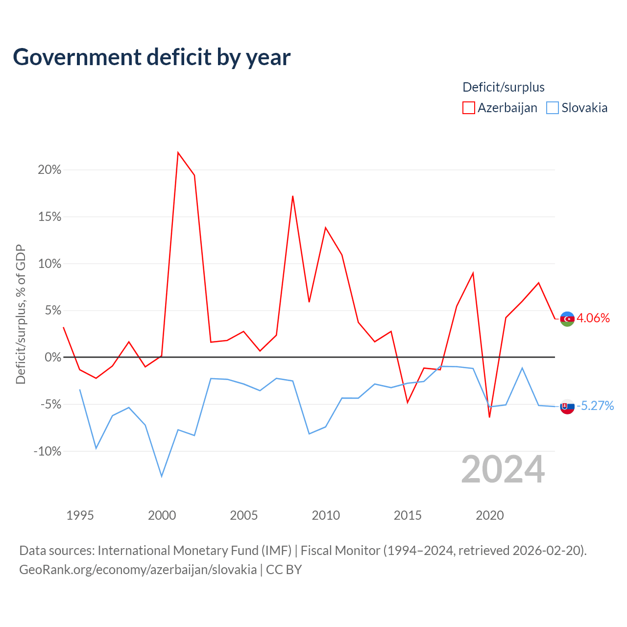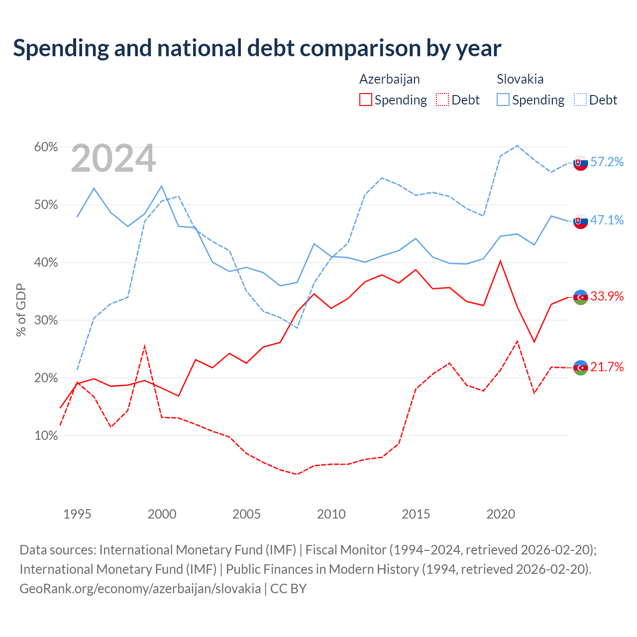 Azerbaijan has $16.1B in government debt (21.7% of GDP), compared to $80.7B (57.2% of GDP) in Slovakia.