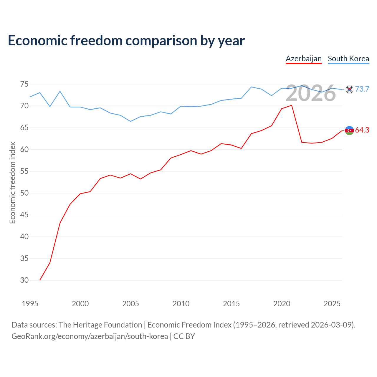 The Economic Freedom Index for Azerbaijan is 64.3, ranking 74/197, compared to 73.7 for South Korea, ranking 24/197. The chart above displays a comparison of annual changes in economic freedom indexes.