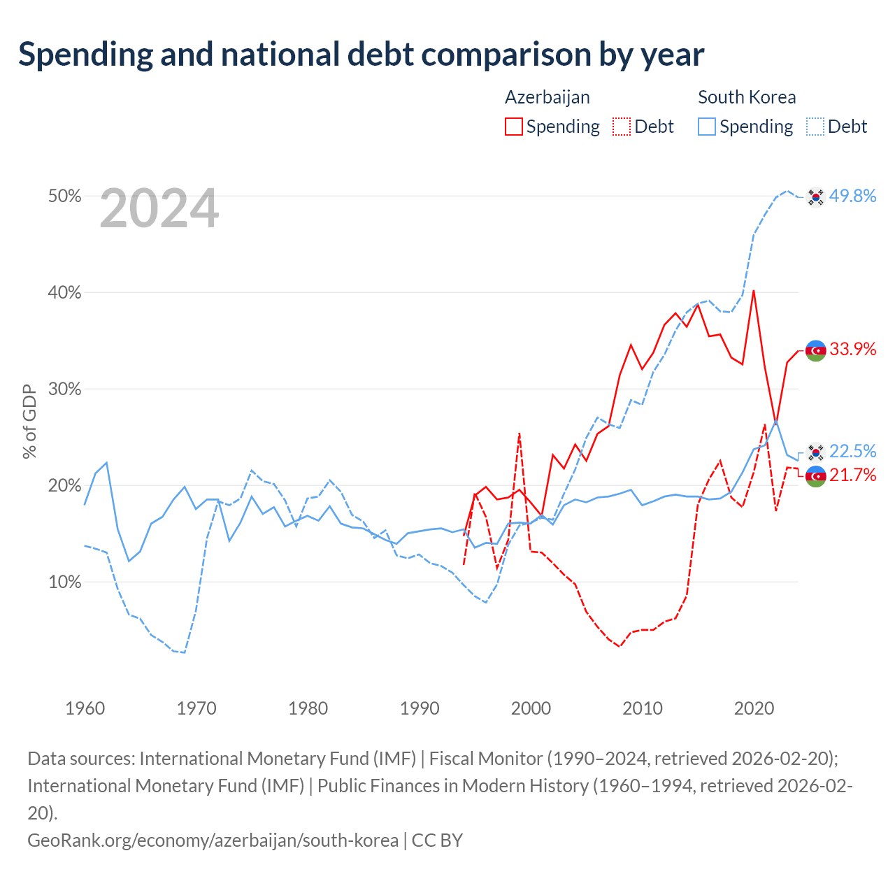 Azerbaijan has $16.1B in government debt (21.7% of GDP), compared to $934B (49.8% of GDP) in South Korea.