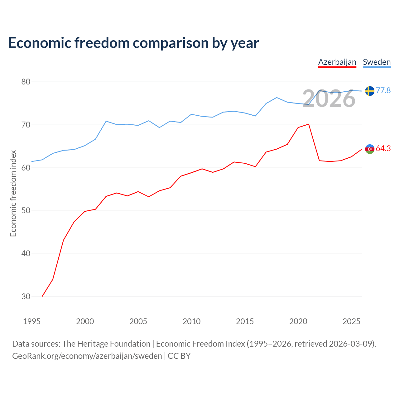 The Economic Freedom Index for Azerbaijan is 64.3, ranking 74/197, compared to 77.8 for Sweden, ranking 14/197. The chart above displays a comparison of annual changes in economic freedom indexes.