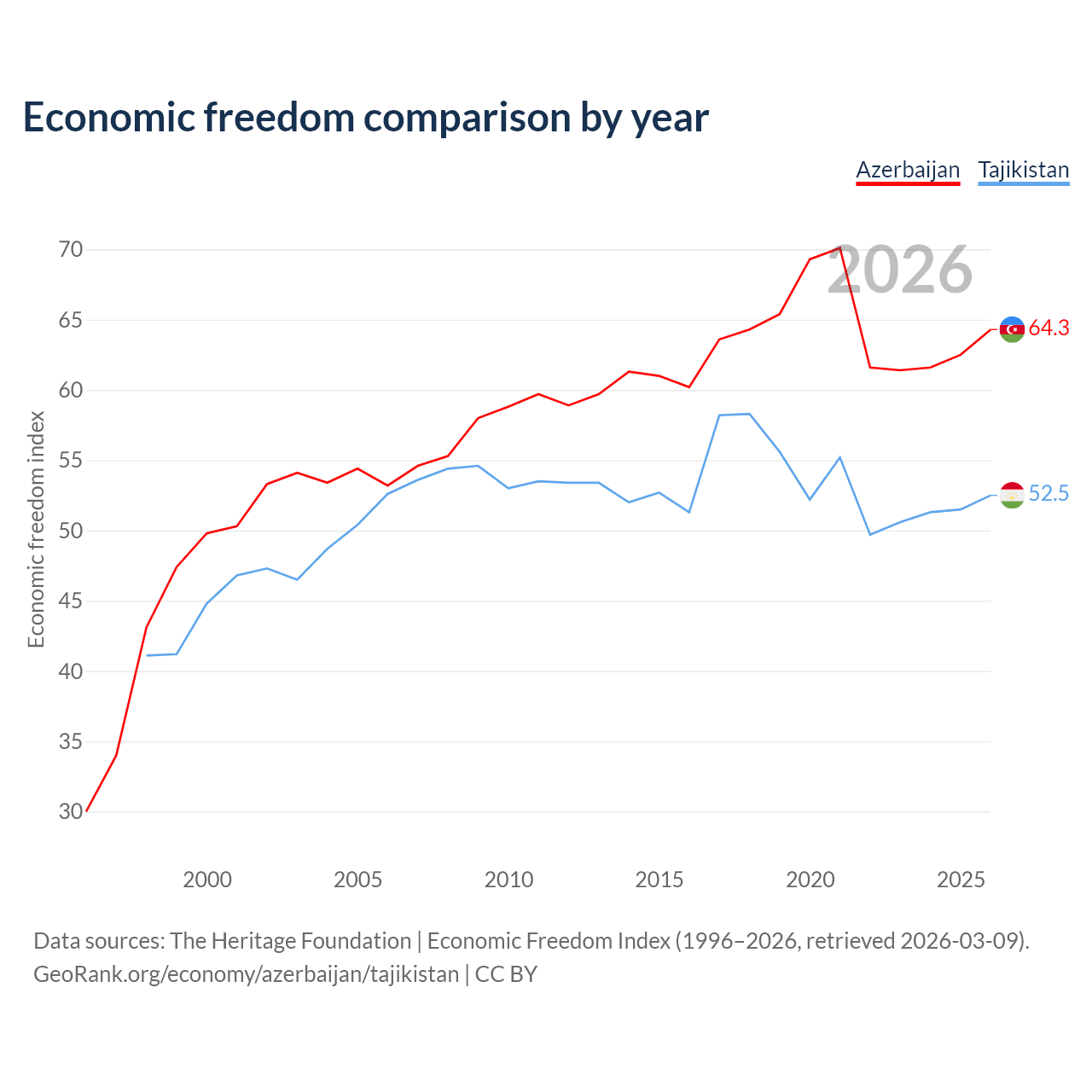 The Economic Freedom Index for Azerbaijan is 64.3, ranking 74/197, compared to 52.5 for Tajikistan, ranking 147/197. The chart above displays a comparison of annual changes in economic freedom indexes.