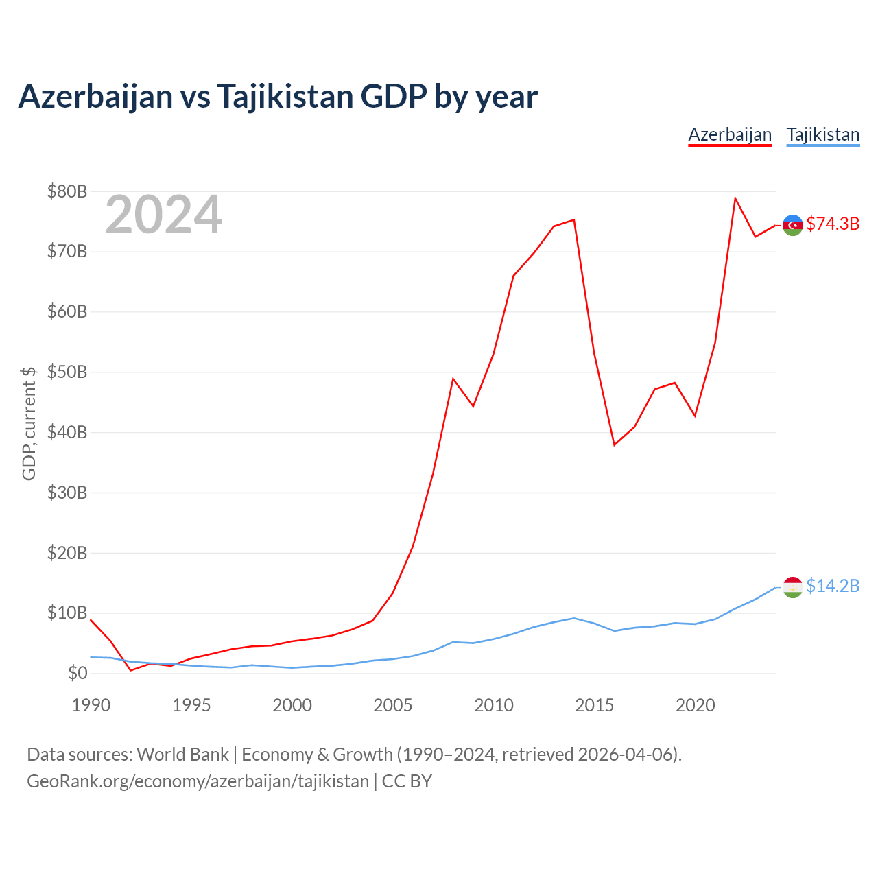 Azerbaijan has a GDP of $74.3B compared to $14.2B for Tajikistan, ranking 84/197 and 145/197 by economy size, respectively.