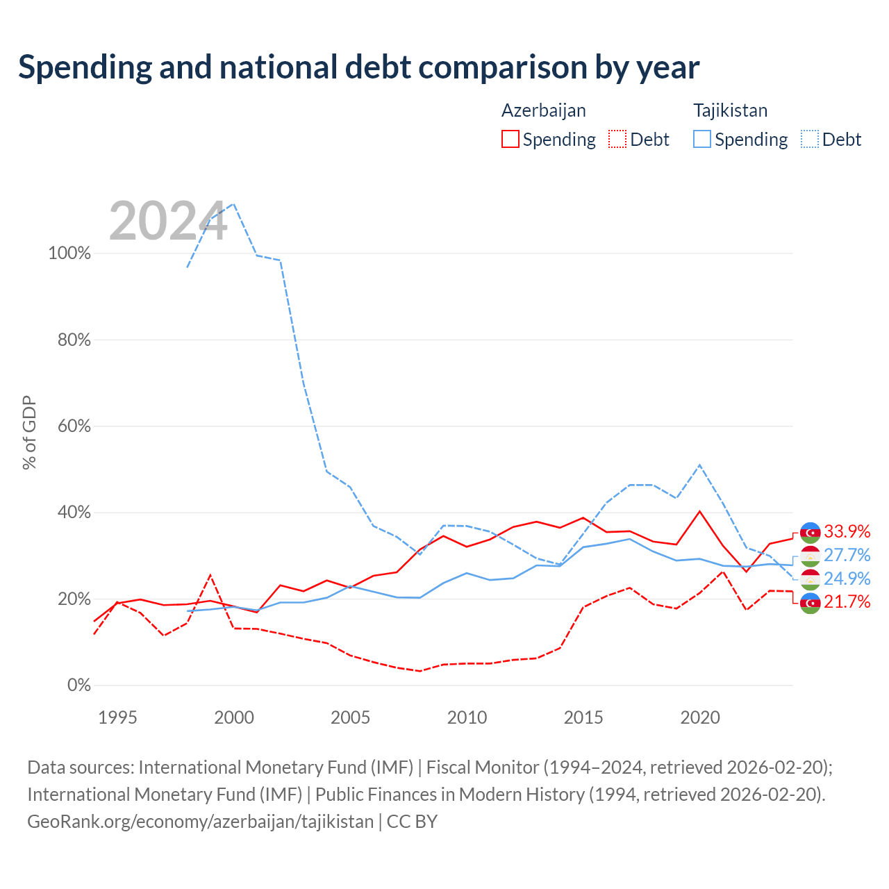 Azerbaijan has $16.1B in government debt (21.7% of GDP), compared to $3.54B (24.9% of GDP) in Tajikistan.