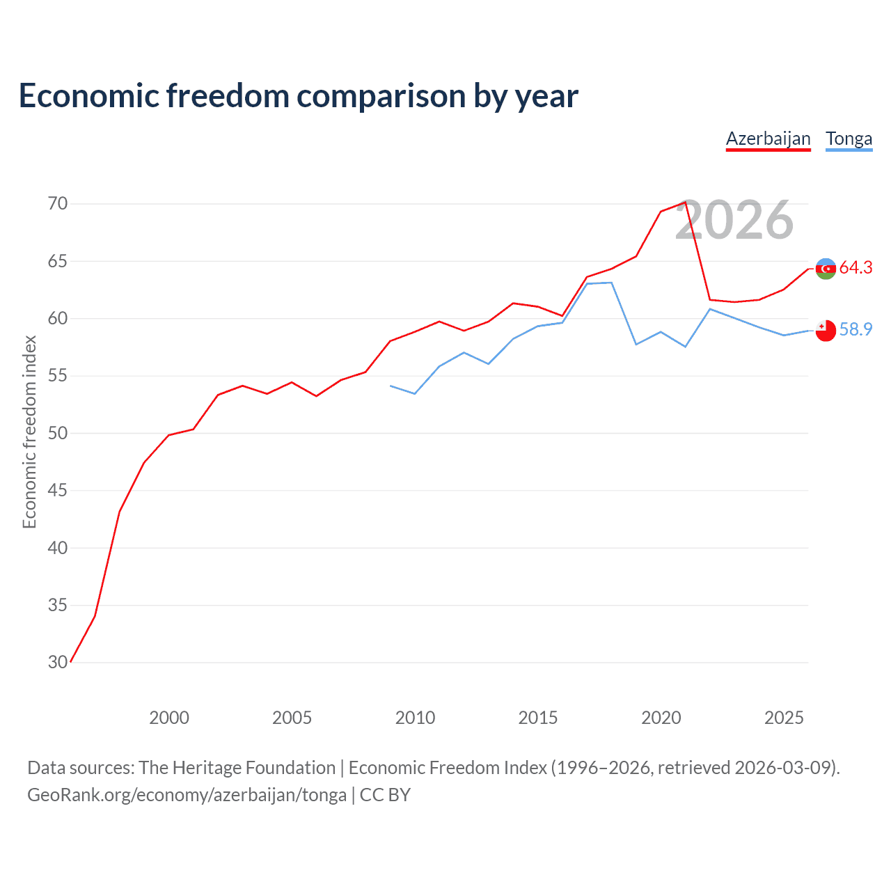 The Economic Freedom Index for Azerbaijan is 64.3, ranking 74/197, compared to 58.9 for Tonga, ranking 107/197. The chart above displays a comparison of annual changes in economic freedom indexes.