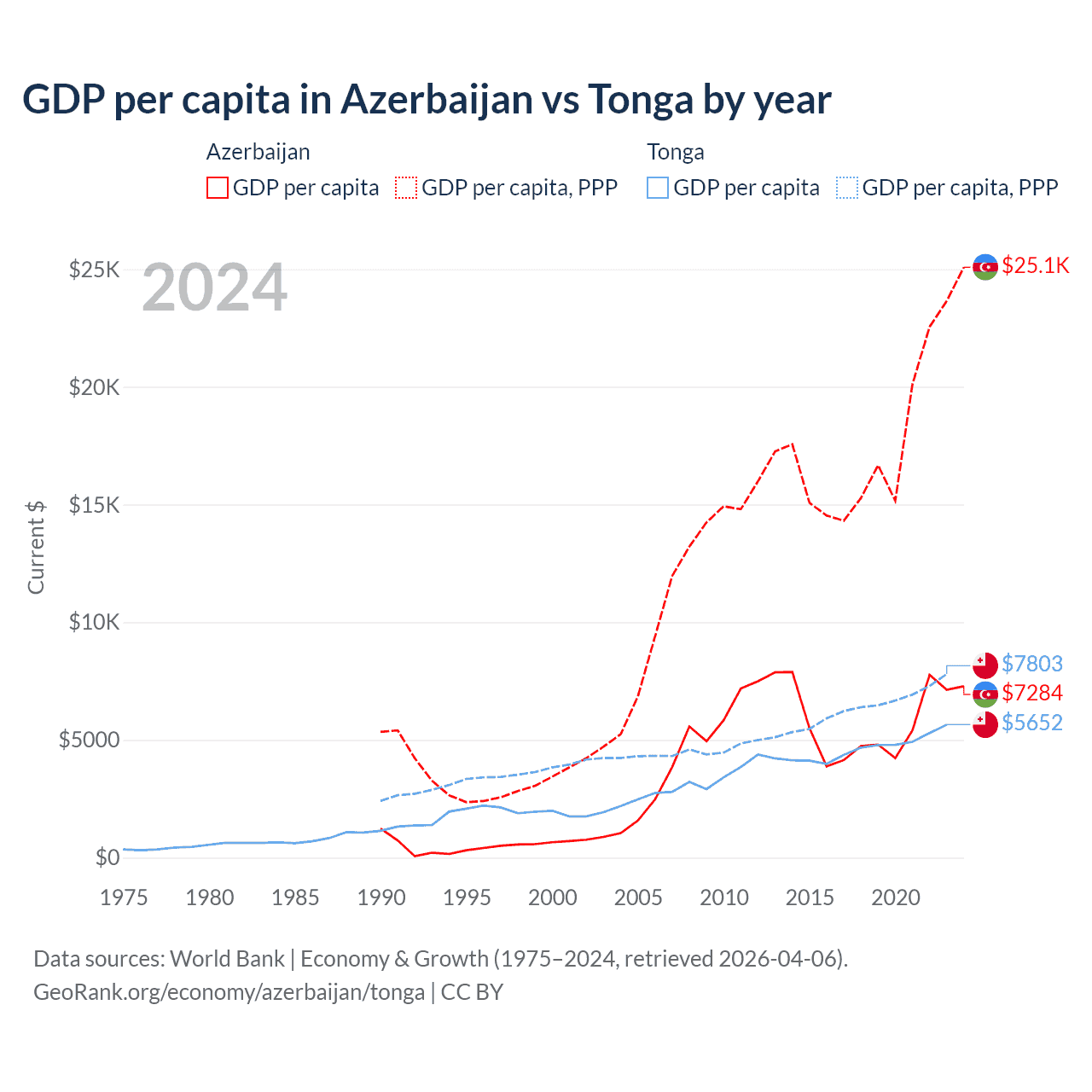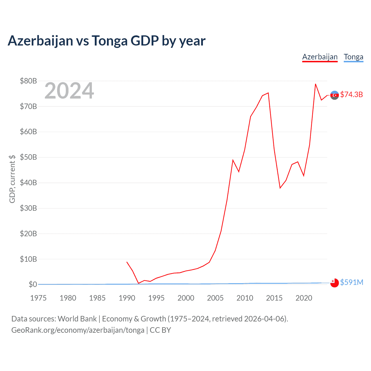 Azerbaijan has a GDP of $74.3B compared to $591M for Tonga, ranking 84/197 and 191/197 by economy size, respectively.