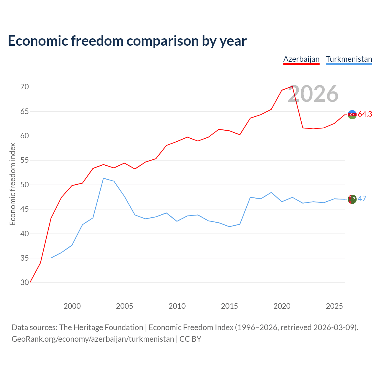 The Economic Freedom Index for Azerbaijan is 64.3, ranking 74/197, compared to 47 for Turkmenistan, ranking 177/197. The chart above displays a comparison of annual changes in economic freedom indexes.