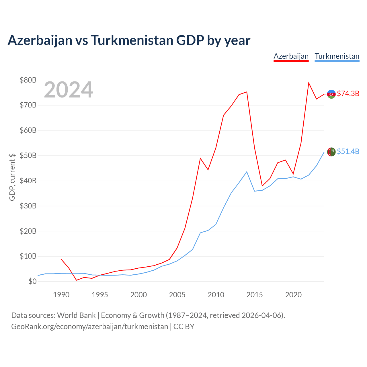 Azerbaijan has a GDP of $74.3B compared to $51.4B for Turkmenistan, ranking 84/197 and 92/197 by economy size, respectively.