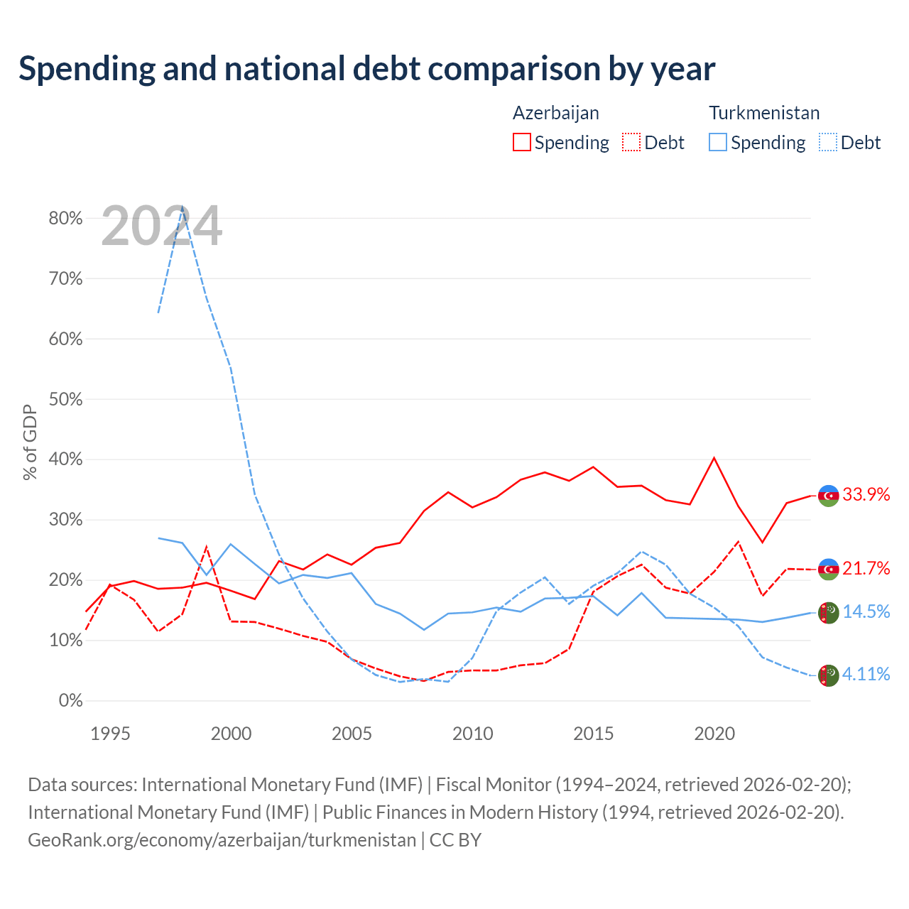 Azerbaijan has $16.1B in government debt (21.7% of GDP), compared to $2.11B (4.11% of GDP) in Turkmenistan.