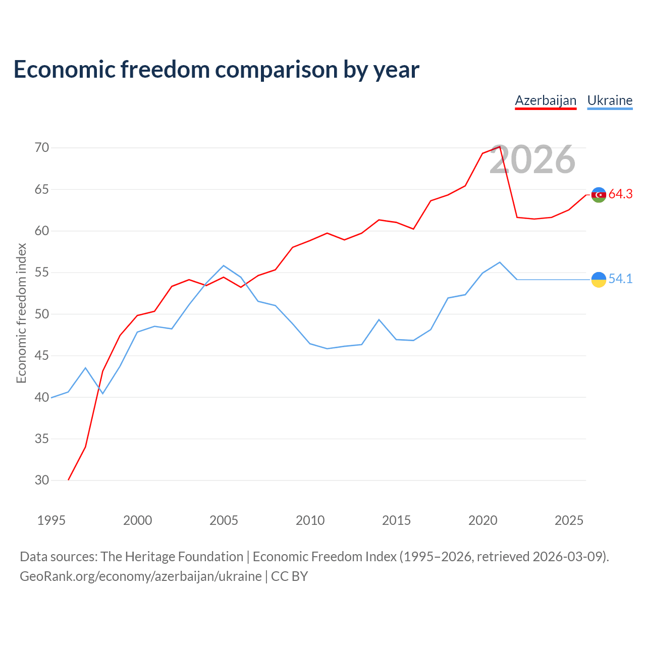 The Economic Freedom Index for Azerbaijan is 64.3, ranking 74/197, compared to 54.1 for Ukraine, ranking 135/197. The chart above displays a comparison of annual changes in economic freedom indexes.