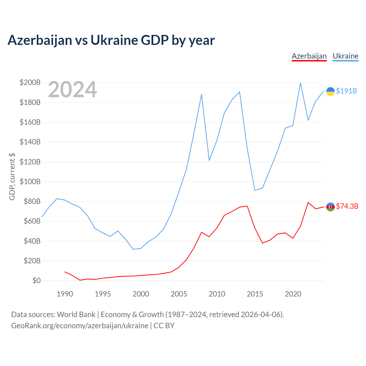Azerbaijan has a GDP of $74.3B compared to $191B for Ukraine, ranking 84/197 and 57/197 by economy size, respectively.