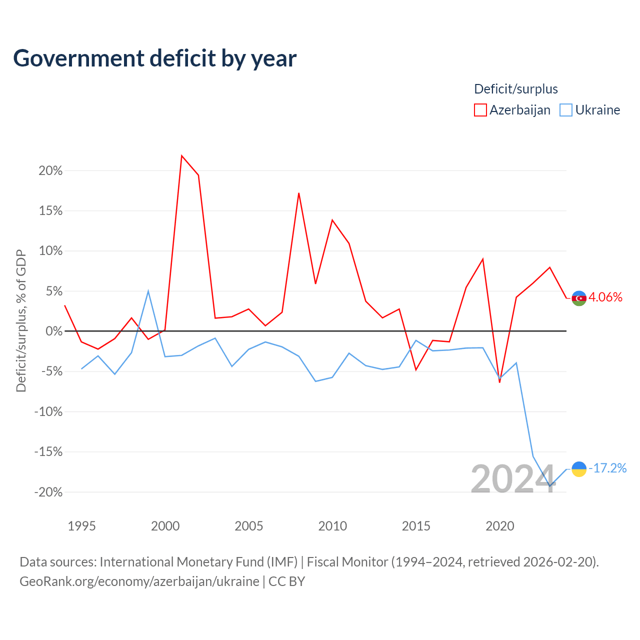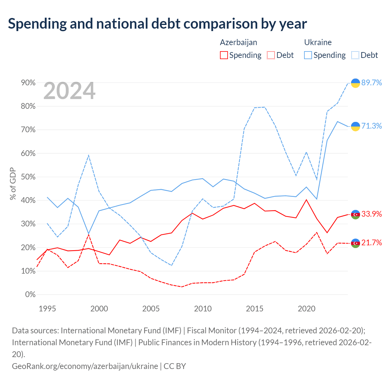 Azerbaijan has $16.1B in government debt (21.7% of GDP), compared to $171B (89.7% of GDP) in Ukraine.