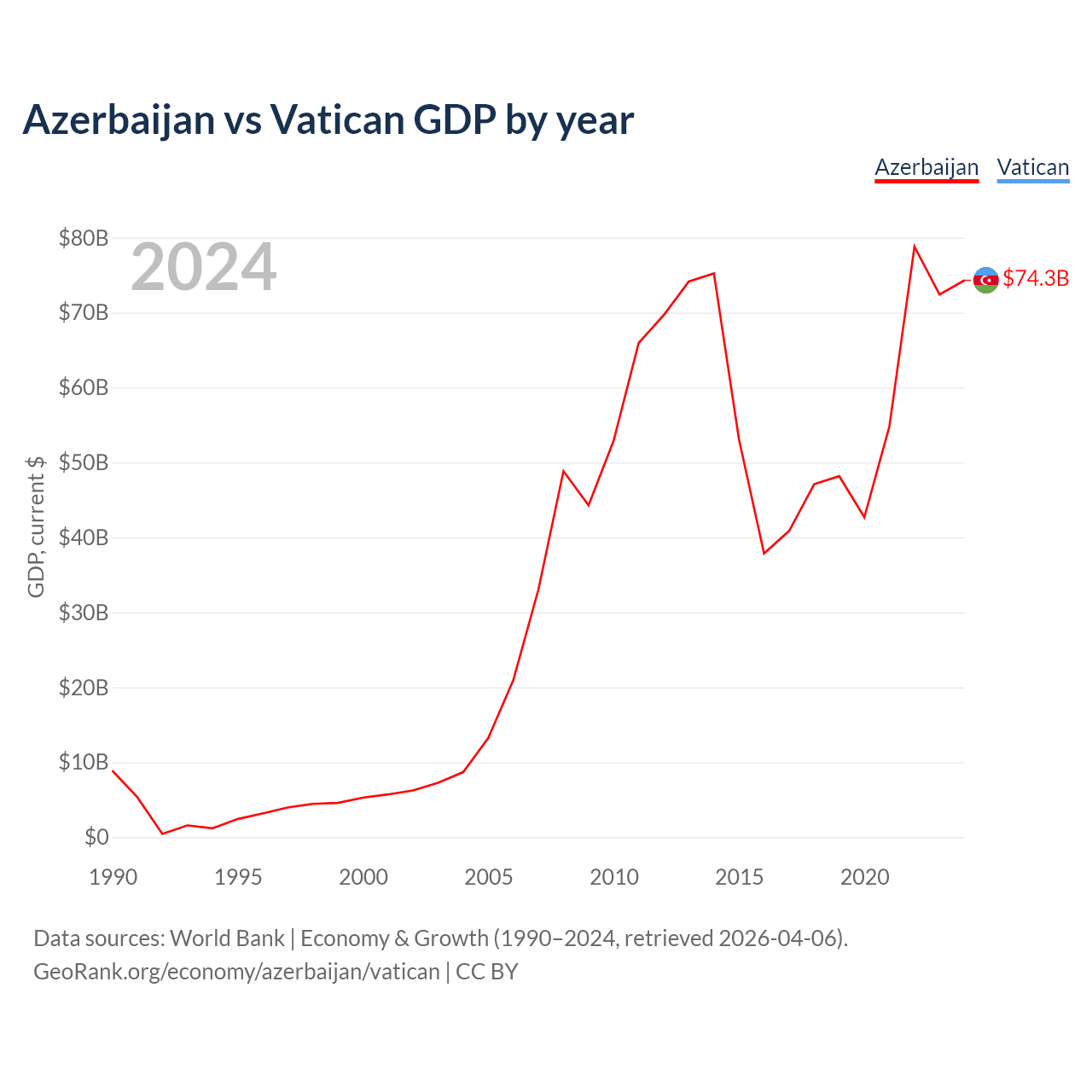 Azerbaijan has a GDP of $74.3B compared to $19.8M for the Vatican, ranking 84/197 and 197/197 by economy size, respectively.