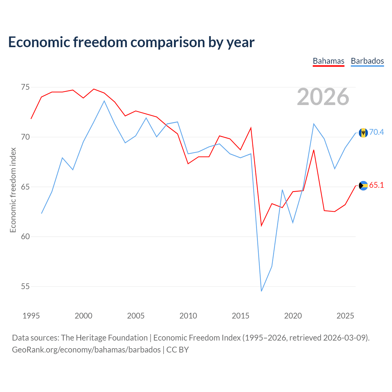 The Economic Freedom Index for the Bahamas is 65.1, ranking 66/197, compared to 70.4 for Barbados, ranking 34/197. The chart above displays a comparison of annual changes in economic freedom indexes.
