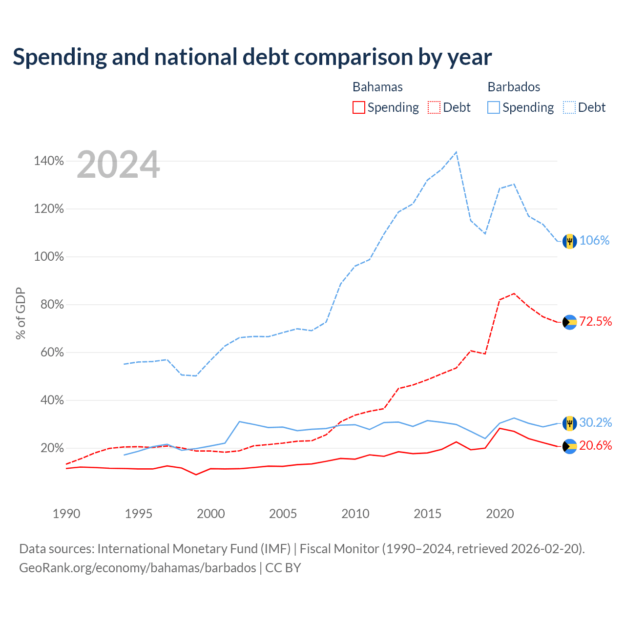 The Bahamas has $11.5B in government debt (72.5% of GDP), compared to $7.97B (106.3% of GDP) in Barbados.