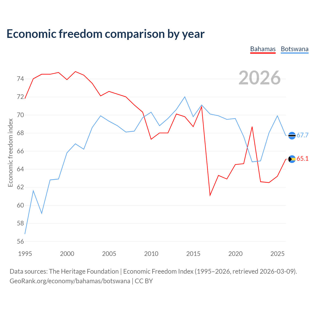 The Economic Freedom Index for the Bahamas is 65.1, ranking 66/197, compared to 67.7 for Botswana, ranking 53/197. The chart above displays a comparison of annual changes in economic freedom indexes.
