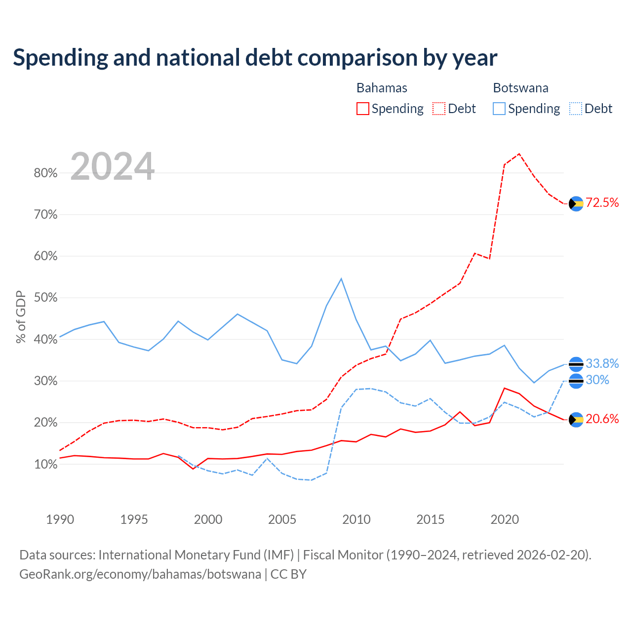 The Bahamas has $11.5B in government debt (72.5% of GDP), compared to $5.82B (30% of GDP) in Botswana.