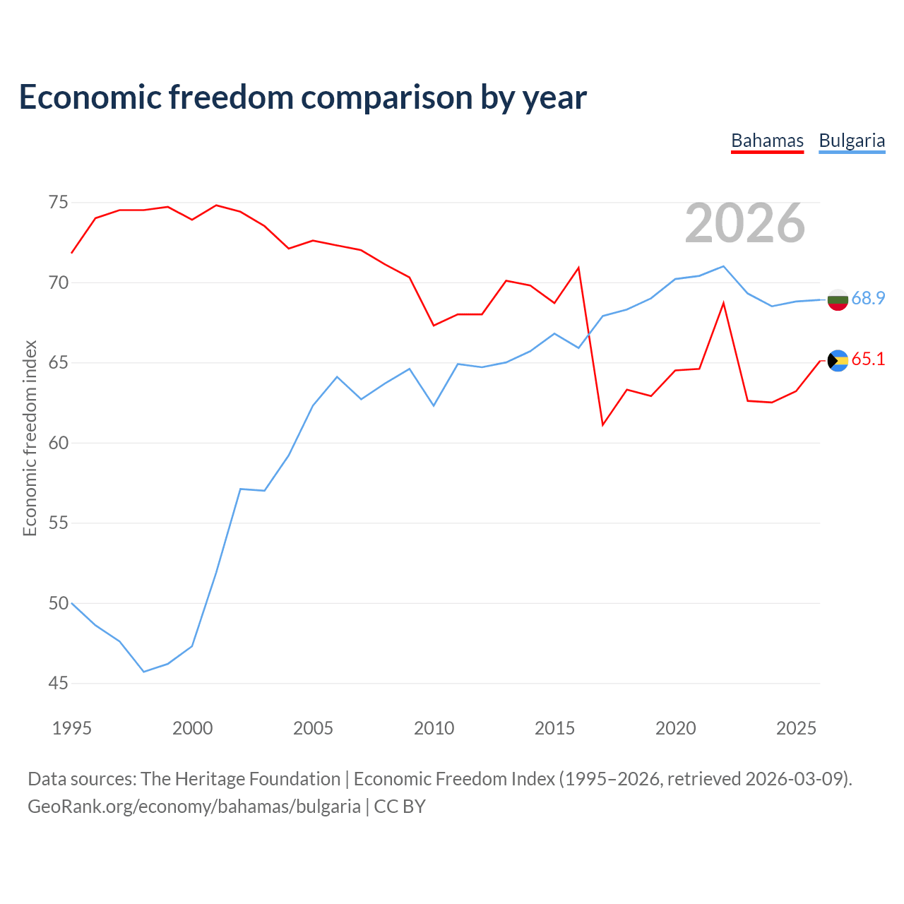 The Economic Freedom Index for the Bahamas is 65.1, ranking 66/197, compared to 68.9 for Bulgaria, ranking 44/197. The chart above displays a comparison of annual changes in economic freedom indexes.