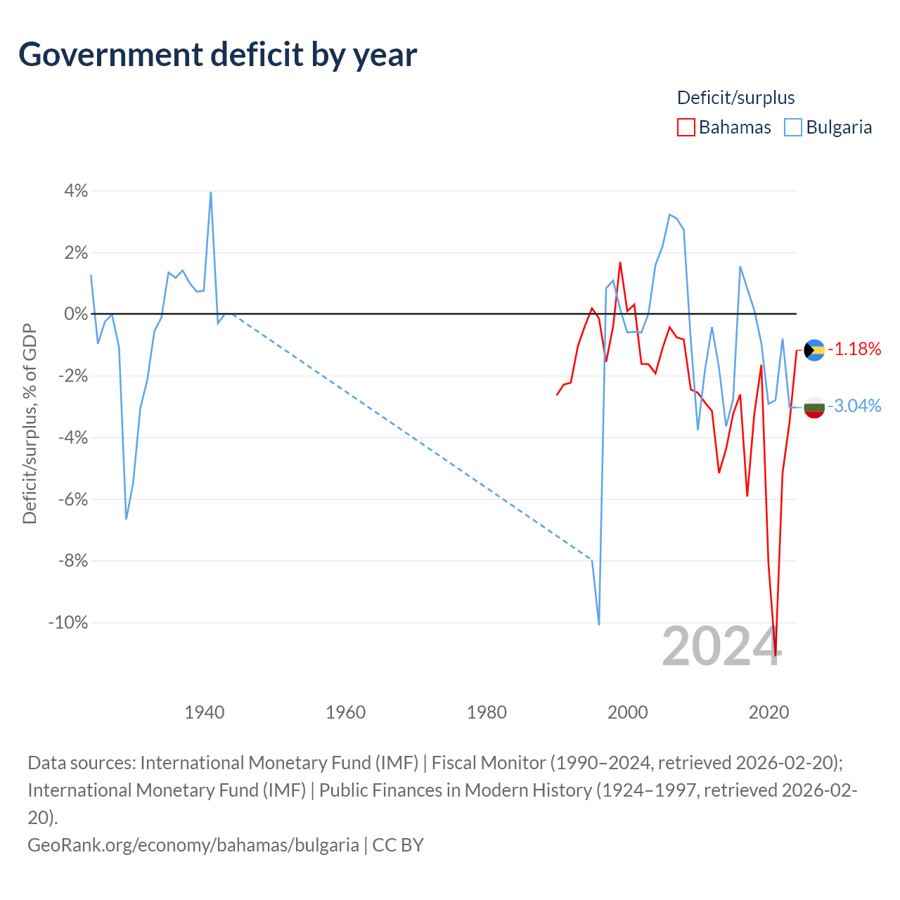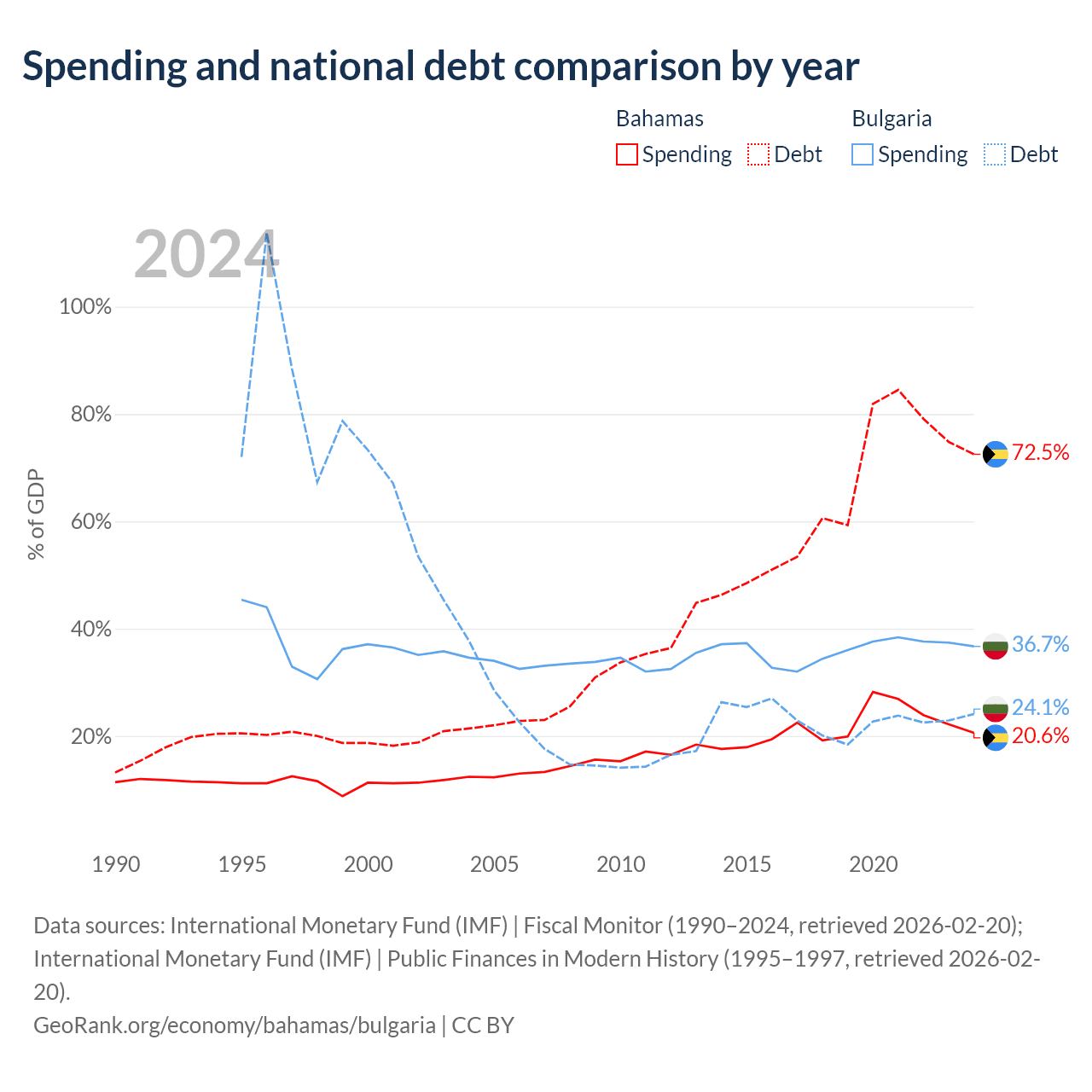 The Bahamas has $11.5B in government debt (72.5% of GDP), compared to $27.3B (24.1% of GDP) in Bulgaria.