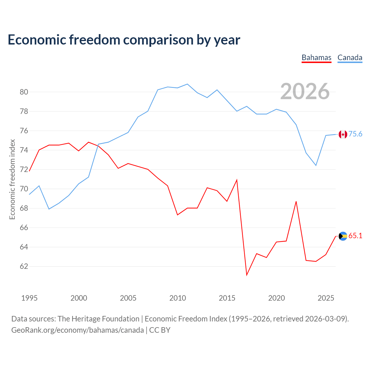 The Economic Freedom Index for the Bahamas is 65.1, ranking 66/197, compared to 75.6 for Canada, ranking 17/197. The chart above displays a comparison of annual changes in economic freedom indexes.