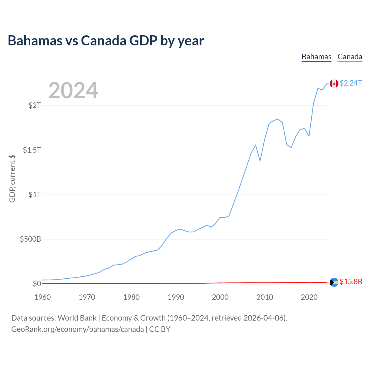 The Bahamas has a GDP of $15.8B compared to $2.24T for Canada, ranking 140/197 and 9/197 by economy size, respectively.