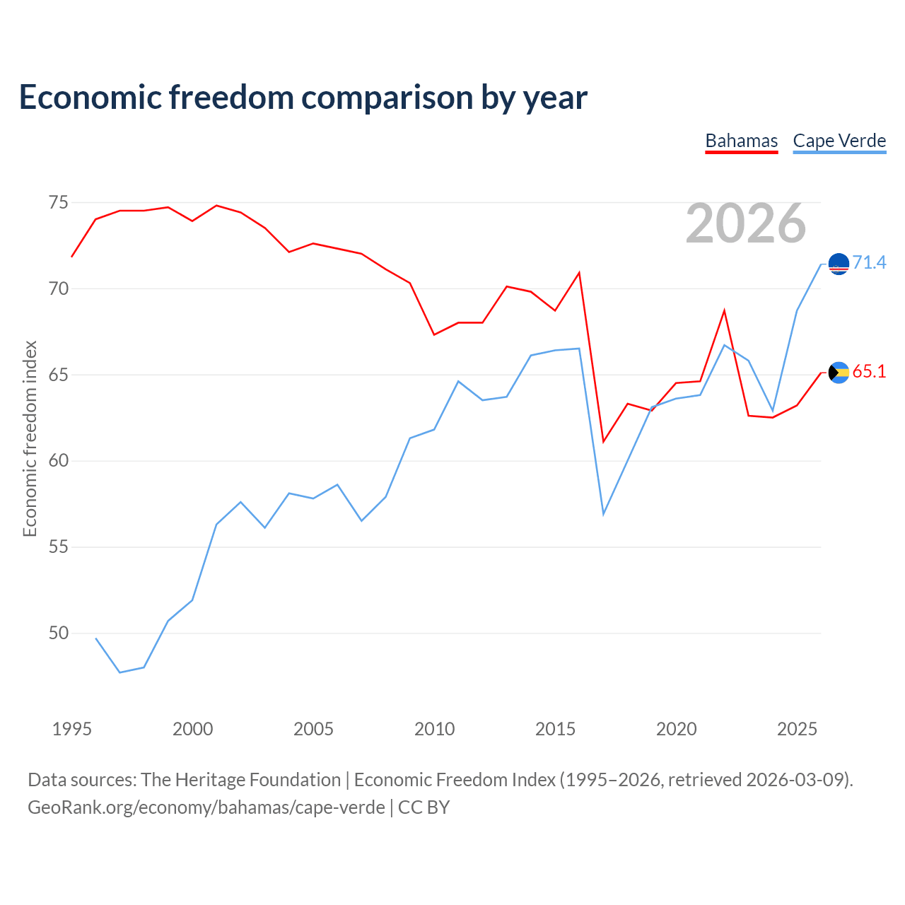 The Economic Freedom Index for the Bahamas is 65.1, ranking 66/197, compared to 71.4 for Cape Verde, ranking 32/197. The chart above displays a comparison of annual changes in economic freedom indexes.