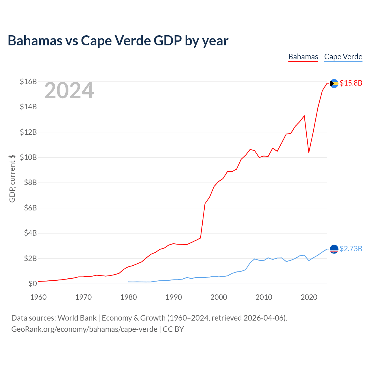 The Bahamas has a GDP of $15.8B compared to $2.73B for Cape Verde, ranking 140/197 and 172/197 by economy size, respectively.