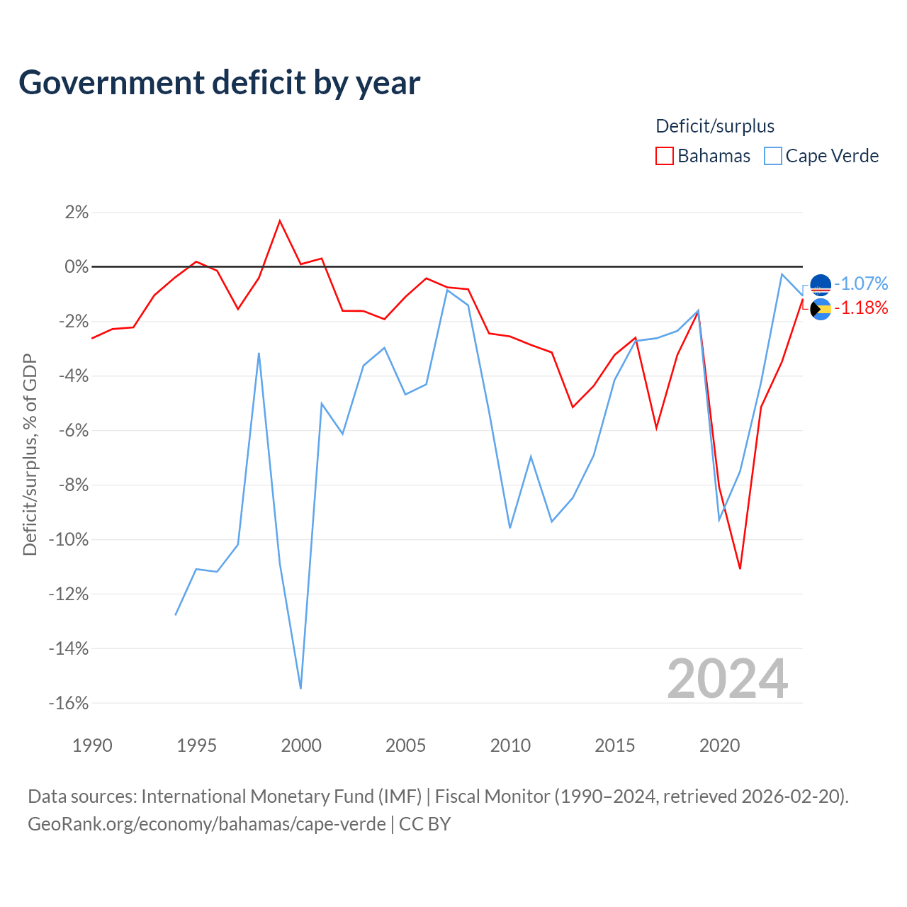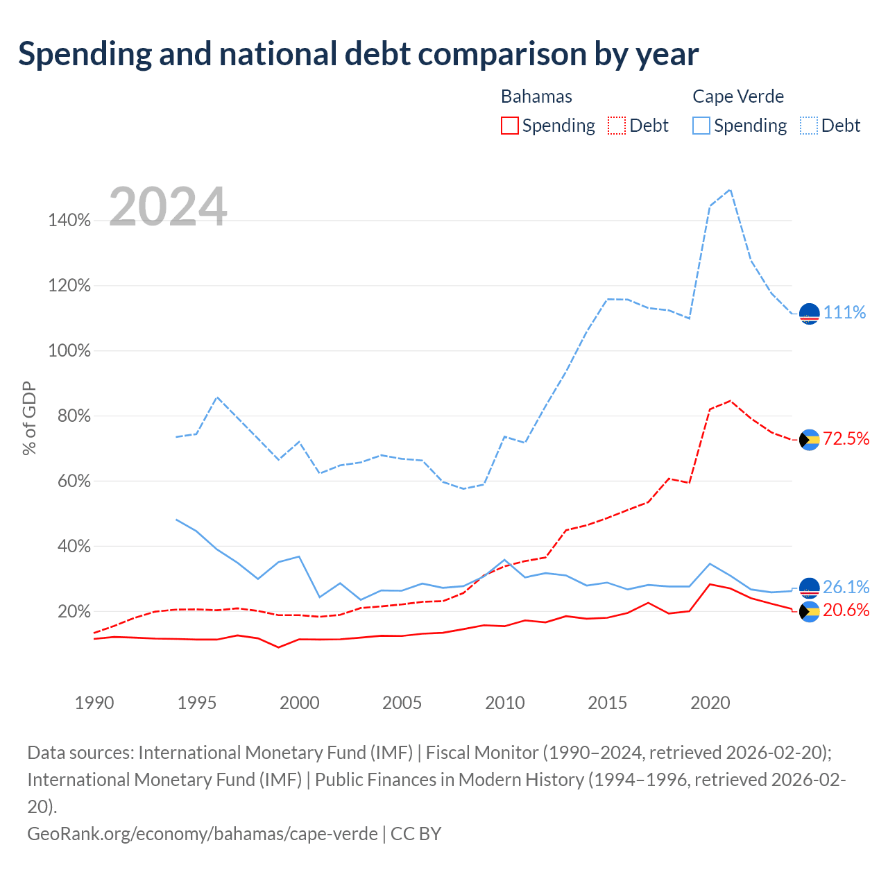 The Bahamas has $11.5B in government debt (72.5% of GDP), compared to $3.03B (111.2% of GDP) in Cape Verde.