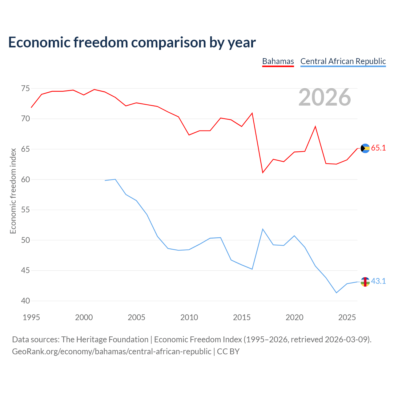 The Economic Freedom Index for the Bahamas is 65.1, ranking 66/197, compared to 43.1 for the Central African Republic, ranking 182/197. The chart above displays a comparison of annual changes in economic freedom indexes.