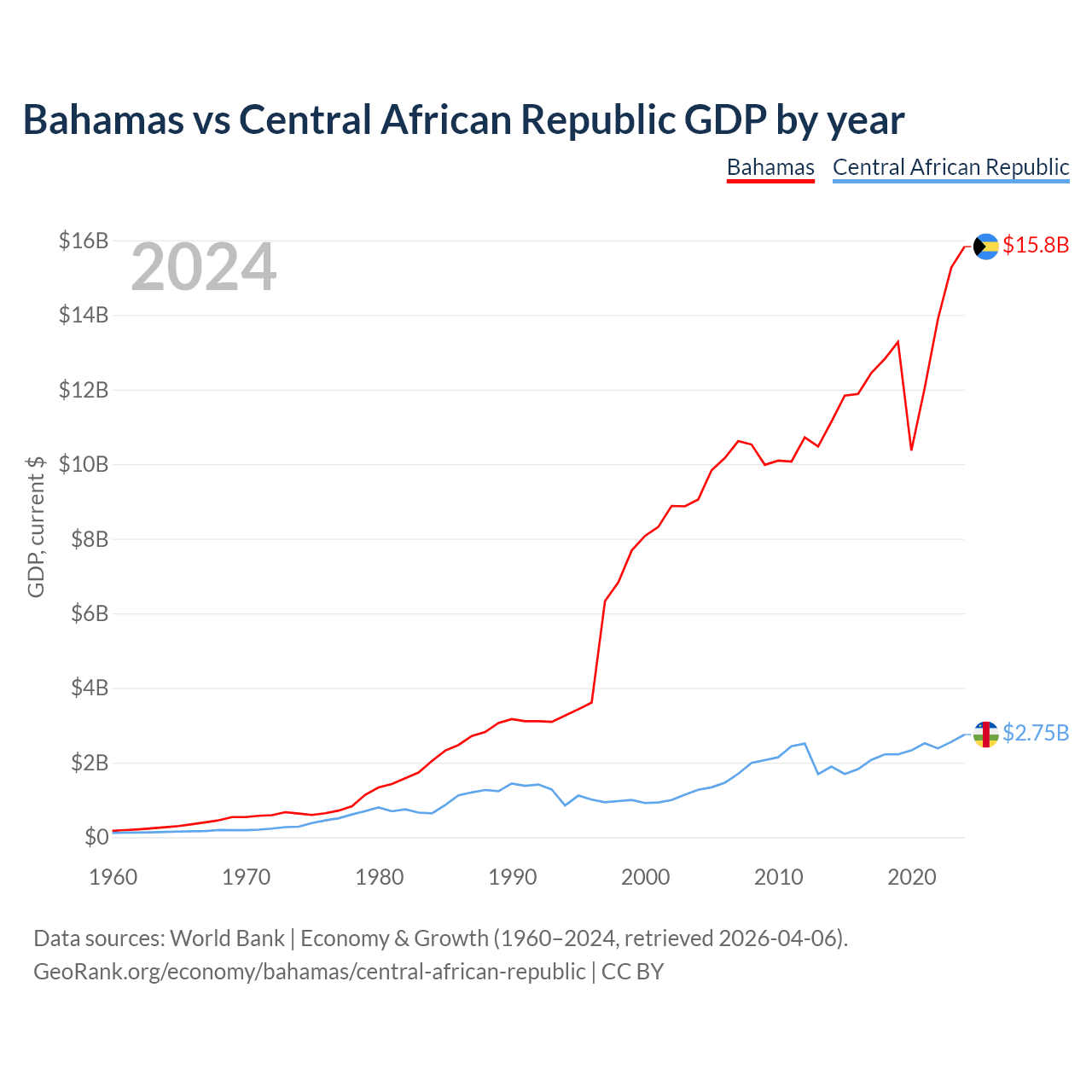 The Bahamas has a GDP of $15.8B compared to $2.75B for the Central African Republic, ranking 140/197 and 171/197 by economy size, respectively.